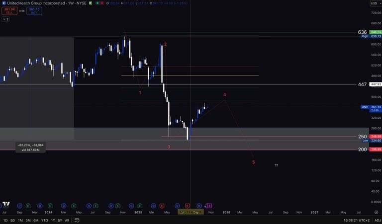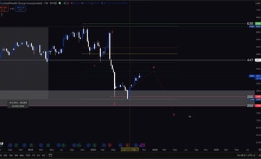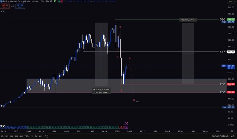 After reaching a cycle top around $636, UNH has retraced sharply by over 60%, returning to the major demand zone between $200 and $250 — a historically strong accumulation region.